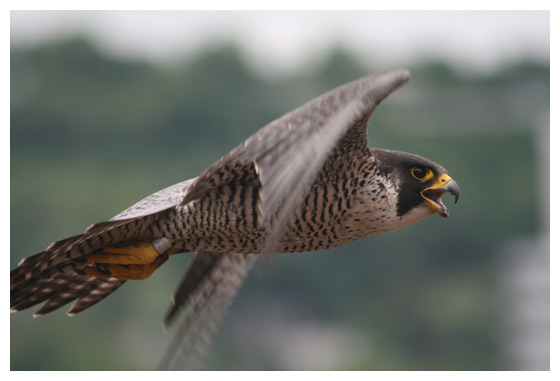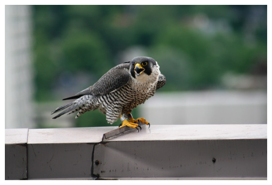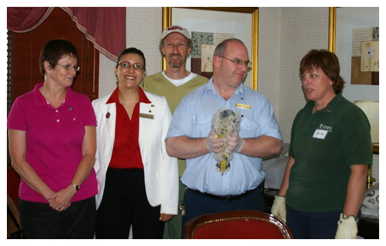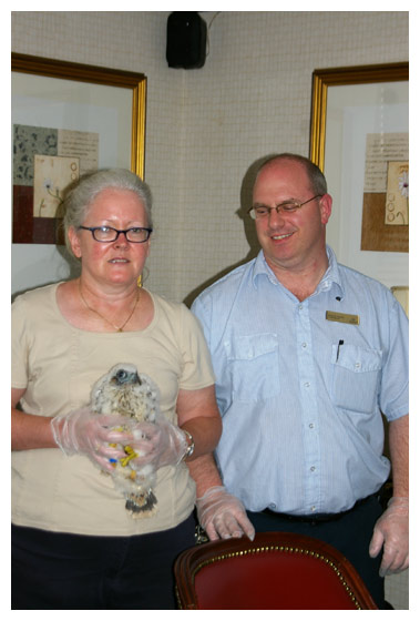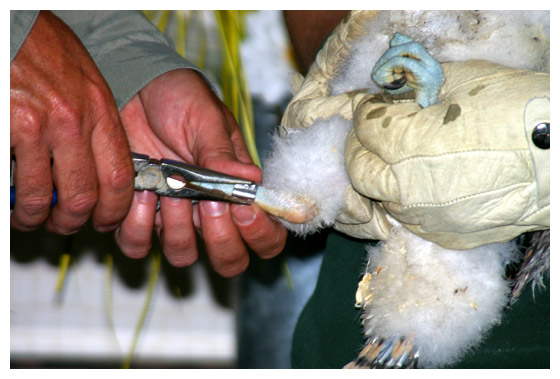 Jump Up weighs in at a healthy 946 grams. (Note the large yellow talons.) Banding is followed by a photo opportunity.