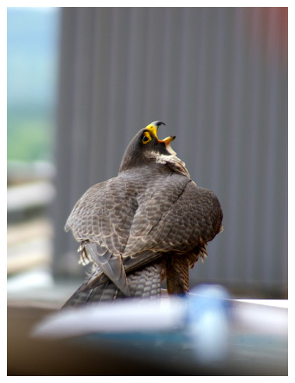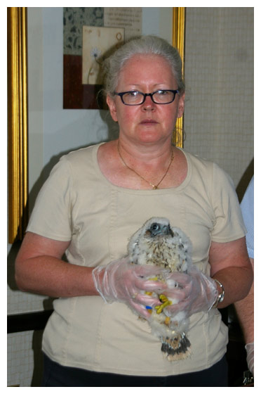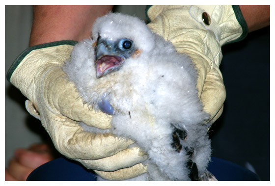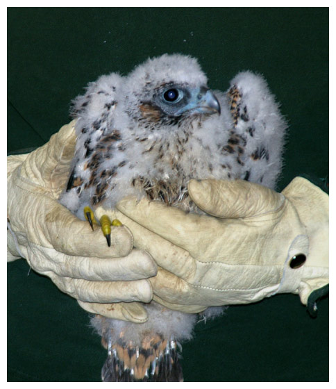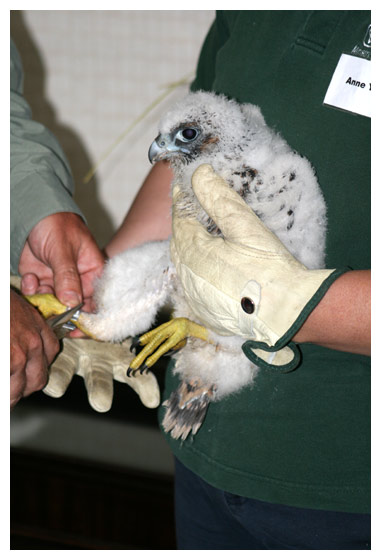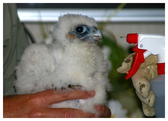 While Jump Up - who this day earns her name by hopping up on a ledge - is left behind at the nest site, Blue Foot is brought inside. Here she is weighed and banded. (Note the blue feet.) A cooling spray of water has a calming effect on the little falcon.