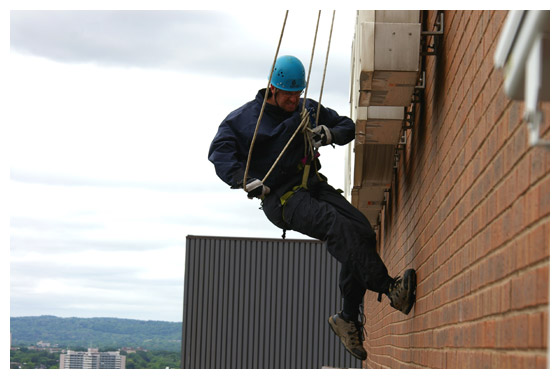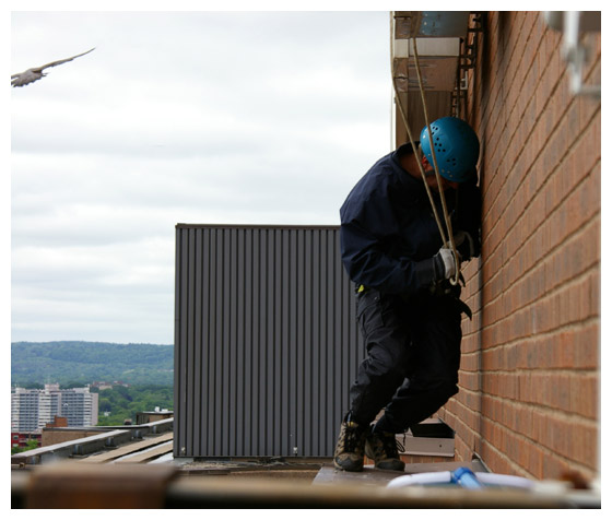 Once Jump Up hops back into the nest, the climber begins his precarious descent, coming down on one corner of the nest ledge. A swimming pool net effectively blocks the other corner. As always, Madame X is in attendance.