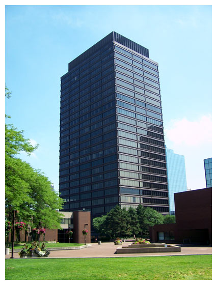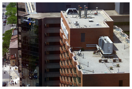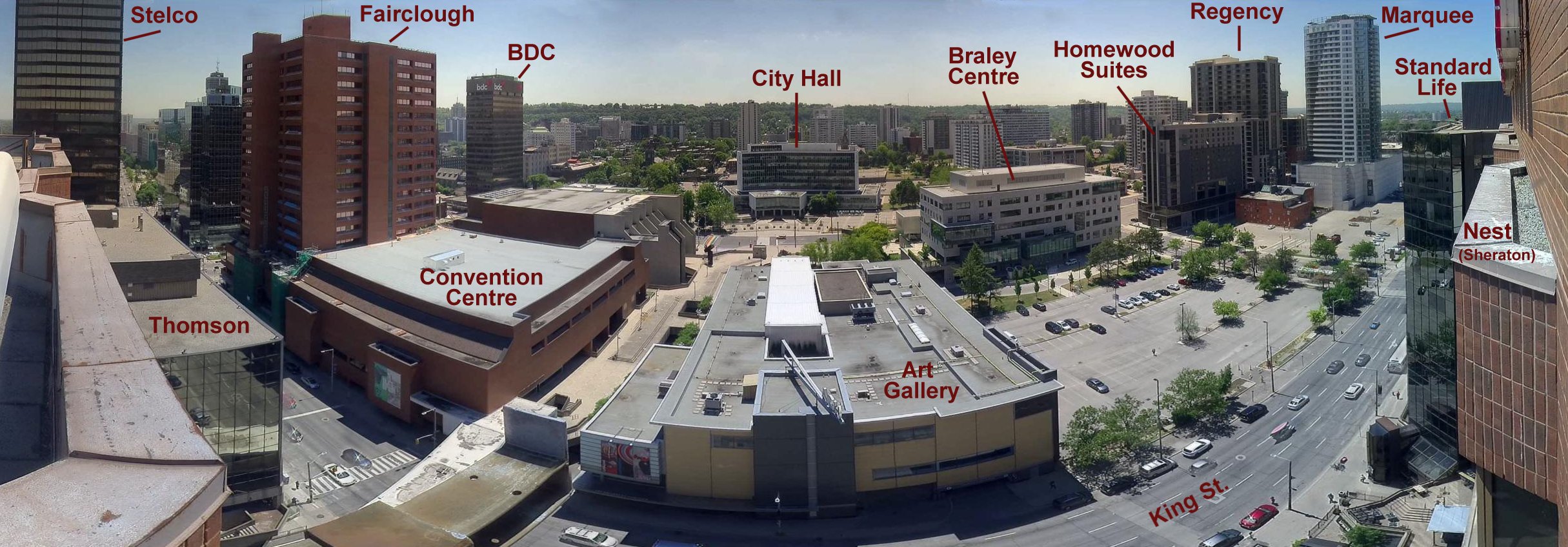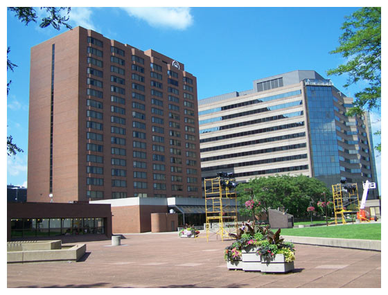 A view of the rear of the Sheraton Hotel (left) and the Standard Life building (right) from the north east corner of Copps Plaza