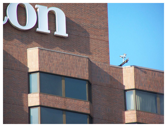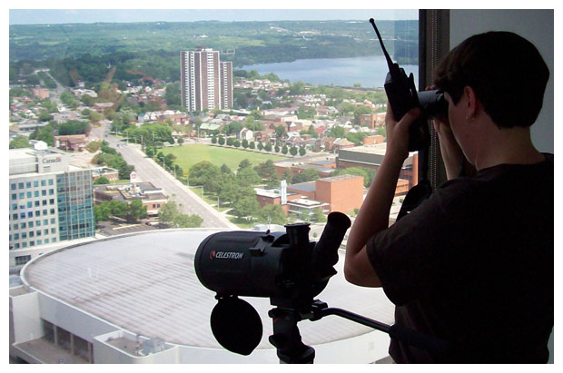 A view of the Sheraton from the Braley Center parking area, where volunteers gather to keep watch over the fledging falcons.