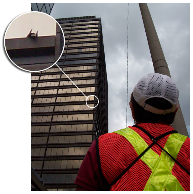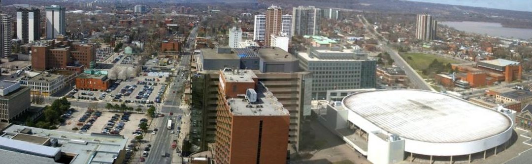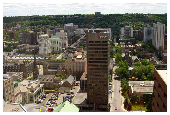 Looking south towards the escarpment from Stelco Tower. The sign on the BDC building is a favorite perch of the adult peregrines.