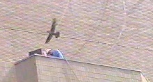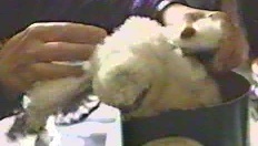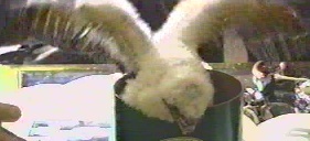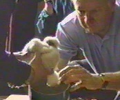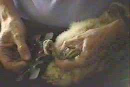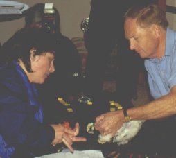 Anne rivets the separate plastic ID band Bruce has placed on Sal's other leg.