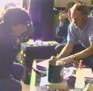 Bruce Duncan prepares to place the aluminum band on Hal's leg.