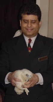 Sheraton Hotel Manager Keval Khanna holds Sal for the camera.