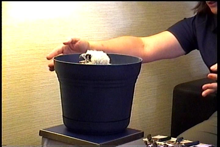 The first chick, Beckett, is placed in a bucket for weighing....