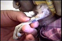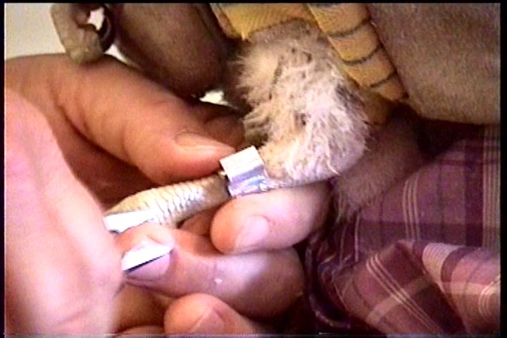 Tiffany's metal band was wrapped with red tape. A few days after banding, Tiffany pulled it off!