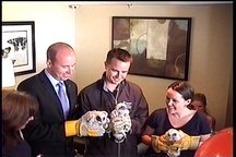 The three chicks pose for photos. On the left is Peter Tosh, Manager of the Sheraton Hamilton. In the centre is Adam Boudens of the Ontario Ministry of Natural Resources. On the right is Emma Ditchburn, one of our 2012 FalconWatch Coordinators.